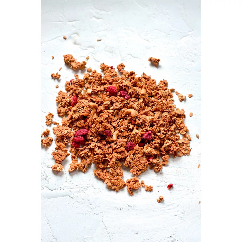 Egyik legnépszerűbb granolánk, nem véletlenül: a finoman fűszeres granola alap, az intenzív ízű, ropogós liofilizált málna, az enyhén pirított kesudió és a savanykás vörösáfonya őrülten finom együtt! Hosszú órákra biztosítja a szükséges energiát, ha dolgozni indul, edzésre szalad, vagy épp a gyerekek készülnek a suliba. A kényelmesebb hétvégi reggeliknek is ellenállhatatlan alkotóeleme, önmagában, vagy egy többfogásos brunch részeként.
