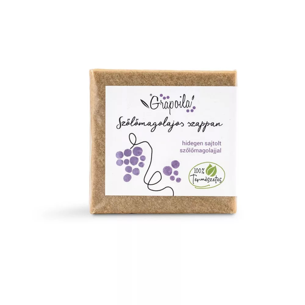 Szappanunk fő alkotóeleme a Grapoila hidegen sajtolt szőlőmagolaj, mely sokoldalúan nyújthat segítséget különböző bőrproblémákra és egyúttal használható kellemes élvezeti cikként is kiegészítve a pipere felszerelésünket. A szőlőmagolajos szappan krémes habja gyengéden tisztítja és ápolja bőrödet, anélkül, hogy kiszárítaná azt. A szőlőhéjőrlemény és zöld agyag kíméletesen leradírozza az elhalt hámsejteket, segítve ezzel a bőr megújulását. A szőlőmagolaj gyulladáscsökkentő hatását a sheavaj, az olíva- és repcemagolaj tovább fokozza. A rozmaring szabályozza a faggyúmirigyek működését, pórustisztító hatását érdemes az arcodon is kipróbálni, ráadásul a citromfű illóolajával együtt minden használat alkalmával finom, frissítő illattal örvendeztet meg.